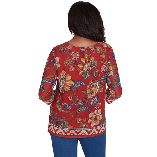 Alfred Dunner Women's Floral Border Mesh Split Neck Top