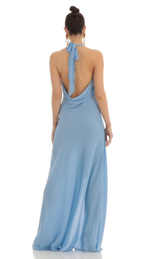 Lucy in the Sky Draped Open Back Maxi Dress in Blue