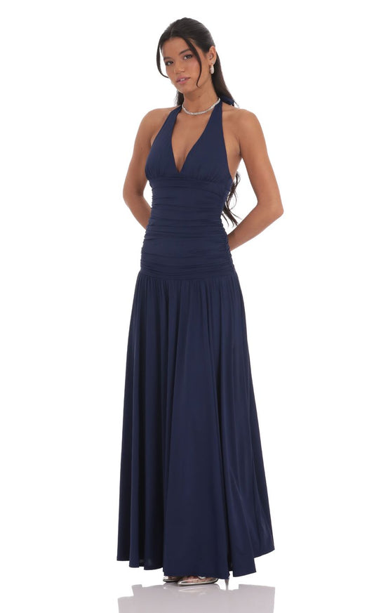 Lucy In The Sky Halter Drop Waist Maxi Dress in Navy