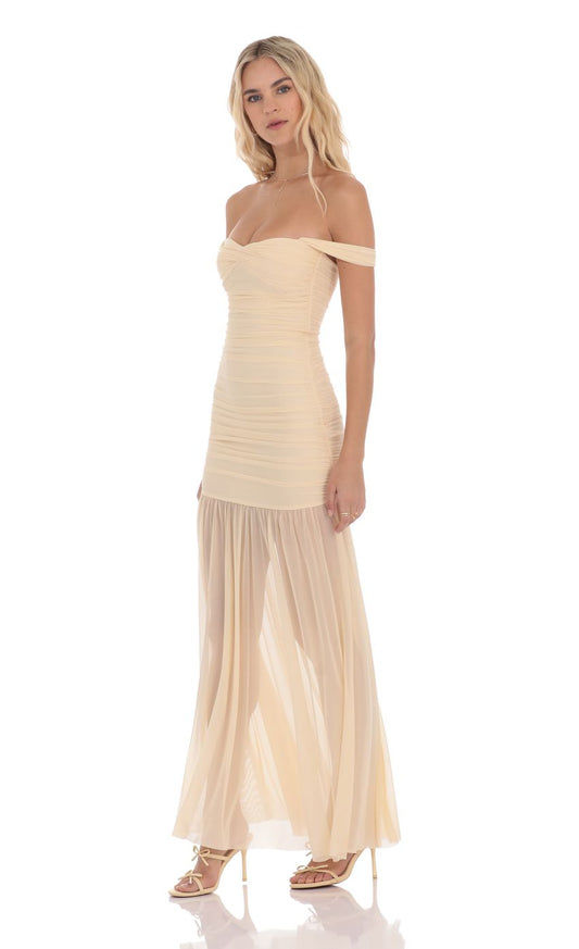 Lucy in the Sky Mesh Off Shoulder Ruched Maxi Dress in Beige