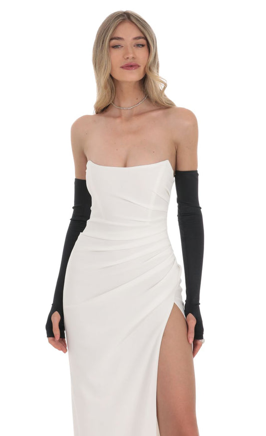 Lucy in the Sky Satin Glove Strapless Corset Maxi Dress in White