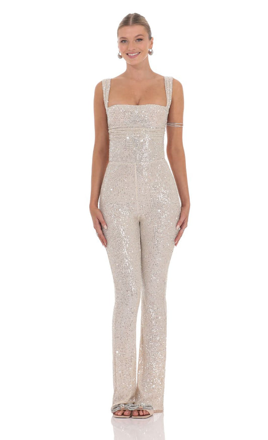 Lucy In The Sky Sequin Back Tie Jumpsuit in Champagne