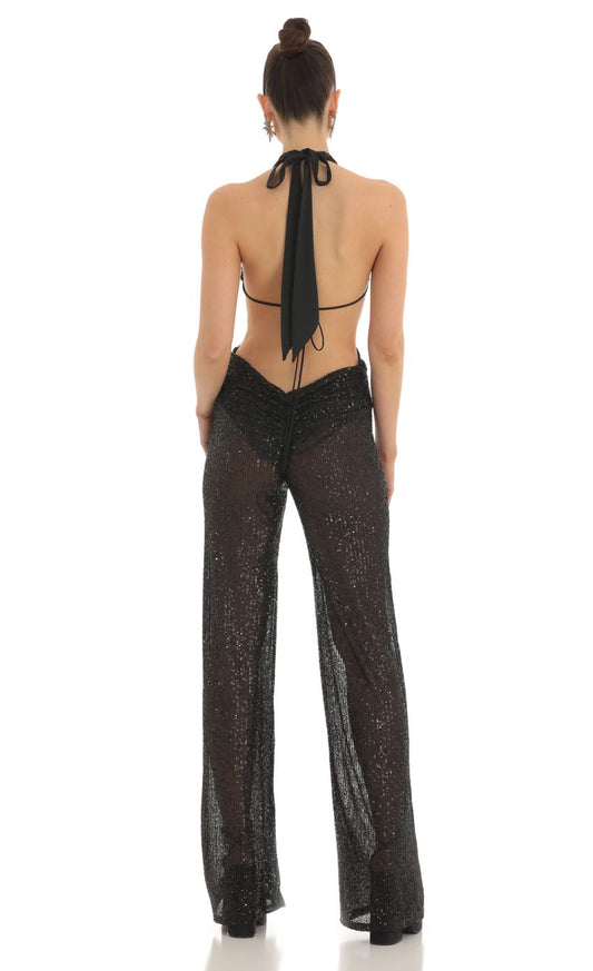 Lucy In The Sky Sequin Plunge Halter Jumpsuit in Black