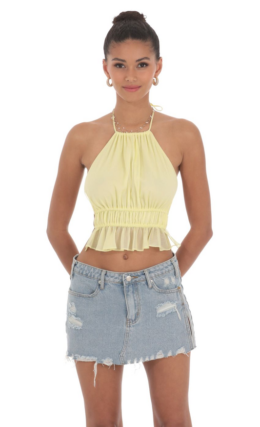 Lucy in the Sky Shimmer Halter Open Back Top in Yellow