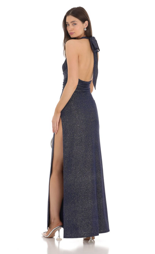 Lucy in the Sky Shimmer Halter Maxi Dress in Navy