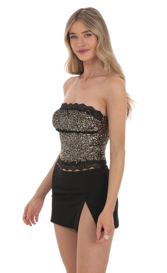 Lucy in the Sky Strapless Gold Sequin Top in Black