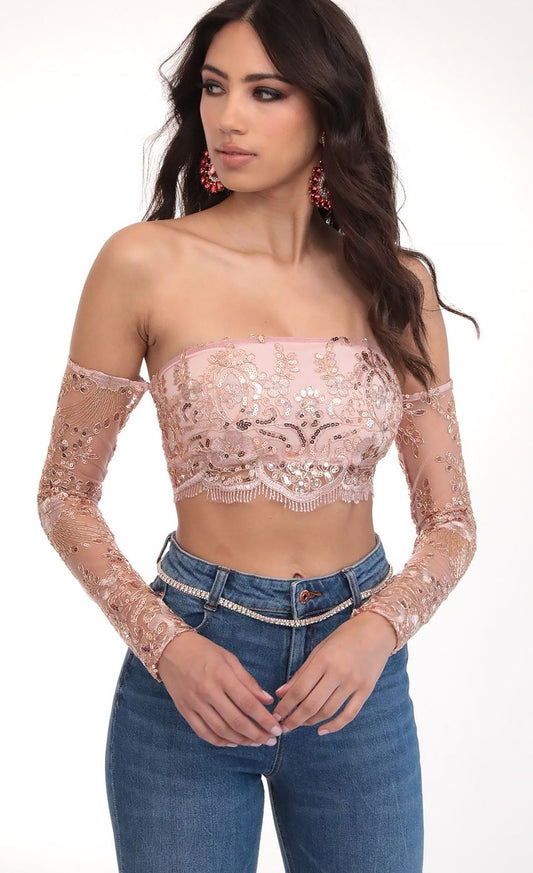 Lucy in the Sky Valentina Gold Sequin Lace Top in Mauve