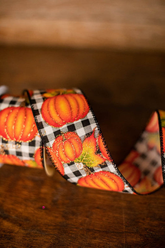 Decorator's Warehouse 2.5" x 10 Yard Pumpkins on Black and White Checkered Ribbon