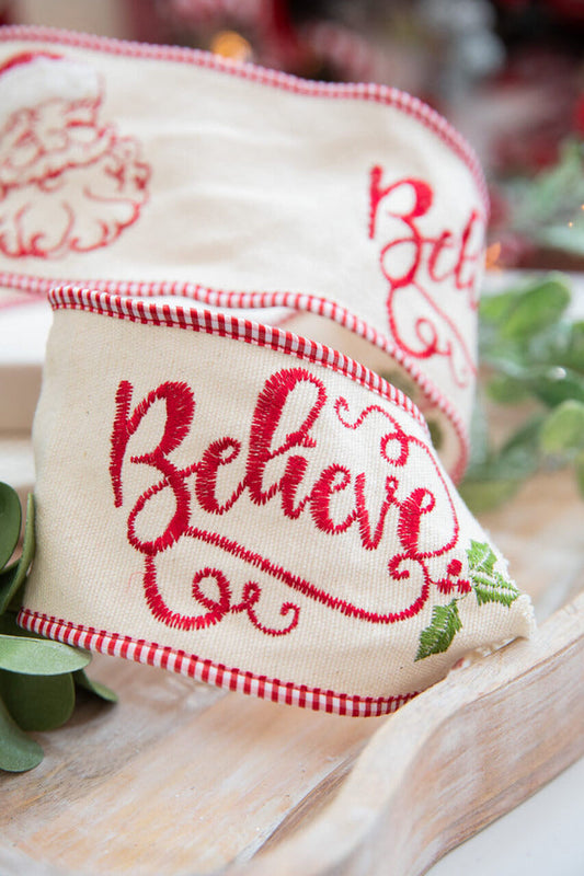 Decorator's Warehouse 4" x 5 Yard Embroidered Santa Face/Believe Ribbon