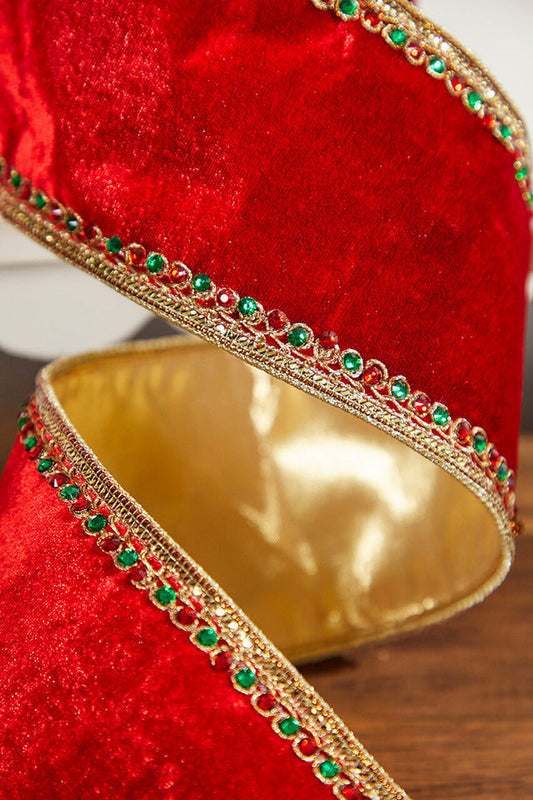 Decorator's Warehouse 4" x 5 Yard Red Velvet Jeweled Edge Dupioni Backed Ribbon