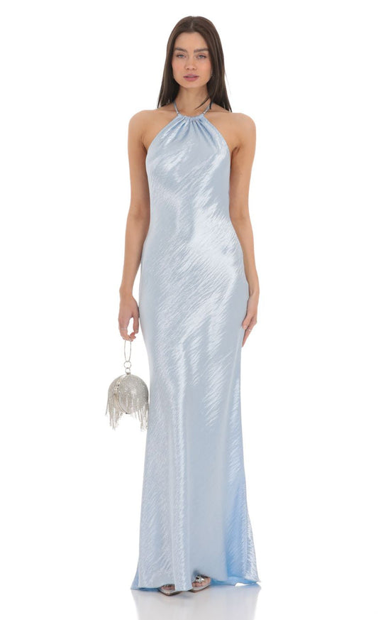 Lucy in the Sky Rhinestone Satin Open Back Maxi Dress in Blue