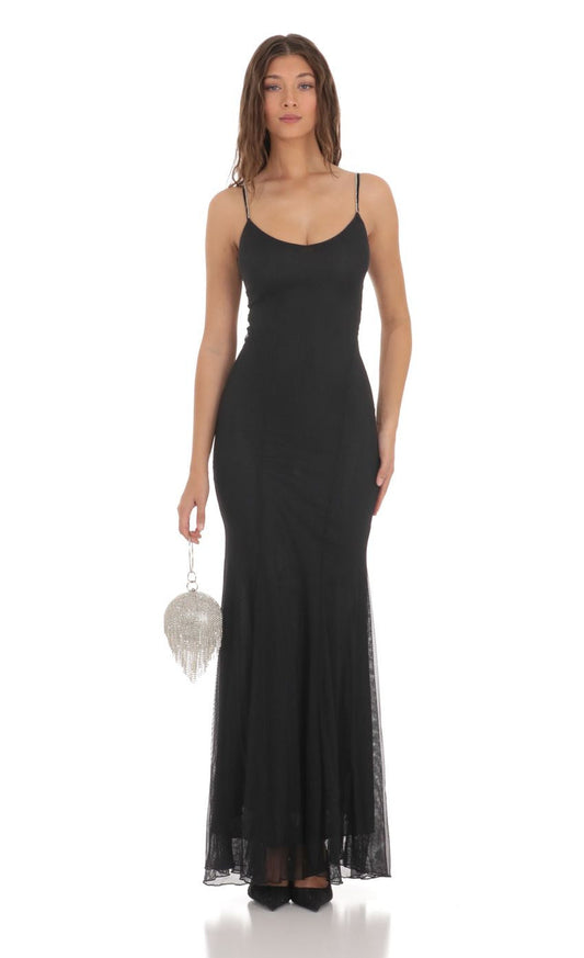 Lucy in the Sky Rhinestone Open Back Shimmer Dress in Black