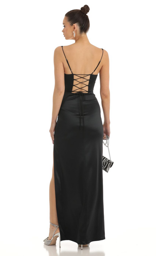 Lucy in the Sky Satin Luxe Rhinestone Strap Maxi Dress in Black