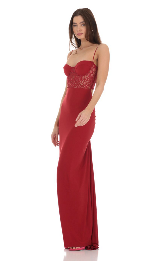 Lucy in the Sky Sequin Lace Cutout Maxi Dress in Red