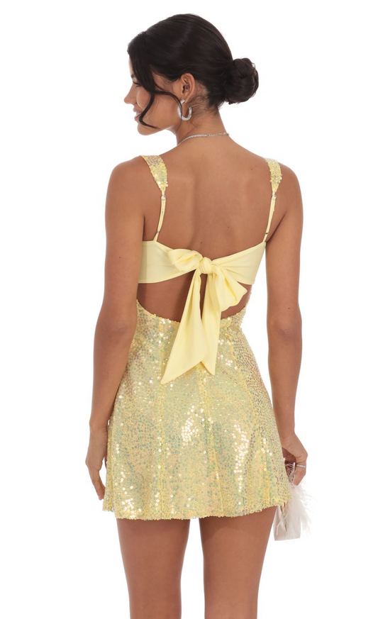 Lucy in the Sky Sequin Glitter Back Bow Bodycon Dress in Yellow