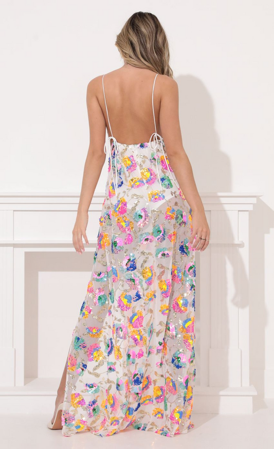Lucy in the Sky Sequin Satin Back Tie Maxi Dress