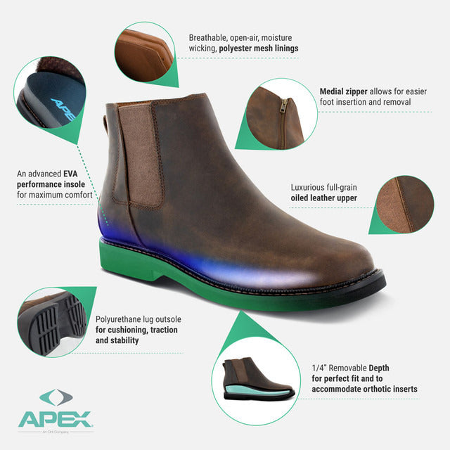 The Logan, Apex’s Chelsea Boot, delivers unmatched comfort and style. A handsome, lace-free design provides easy foot insertion, while removable EVA insoles and depth inserts offer a customized fit.