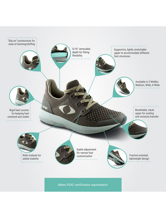 Look & Feel Great With Every Step - The Apex Performance Athletic Sneaker, the newest addition to the Apex Active Collection, is equally comfortable and stylish. The traction-orientated, lightweight design makes it perfect for day-to-day wear; the breathable, open mesh upper supports cooling and moisture transfer and the rigid heel counter helps to keep your heel centered and stable.