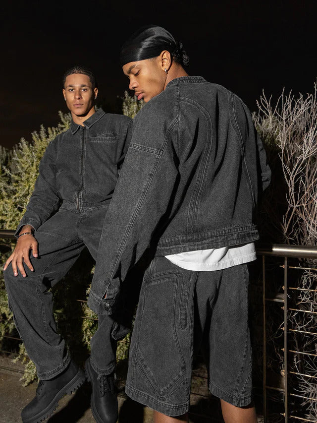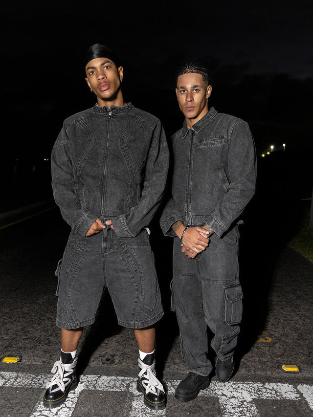 Crafted from cotton made denim, the Lined Denim Biker Jacket features an overlapped panel design, with layered cutting lines on both sides and curved welt pockets at the front. Finished with snap buttons at the collar and hem, and sand-washed effect.