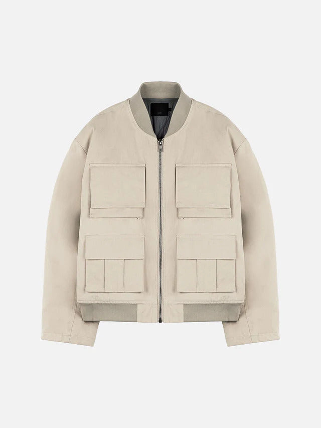 Crafted from cotton made canvas, the Multi-pockets Bomber Jacket features chest and boxed pockets. Attached with snap-button strap and zipper opening on sleeve cuff.