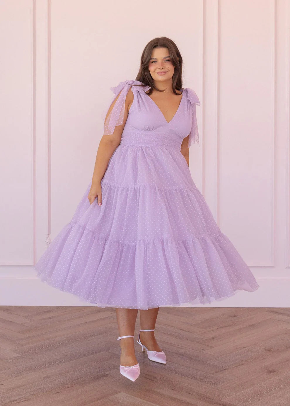 The Jeanne Dress is a romantic dream brought to life with soft layers of ivory dotted tulle and a tiered silhouette that floats with every step. Delicate shoulder bows add a whimsical touch, while the flattering smocked waist and deep V-neckline create an effortlessly feminine shape. Perfect for bridal showers, garden parties, or twirling under fairy lights. This dress is a timeless piece that captures charm in every detail.