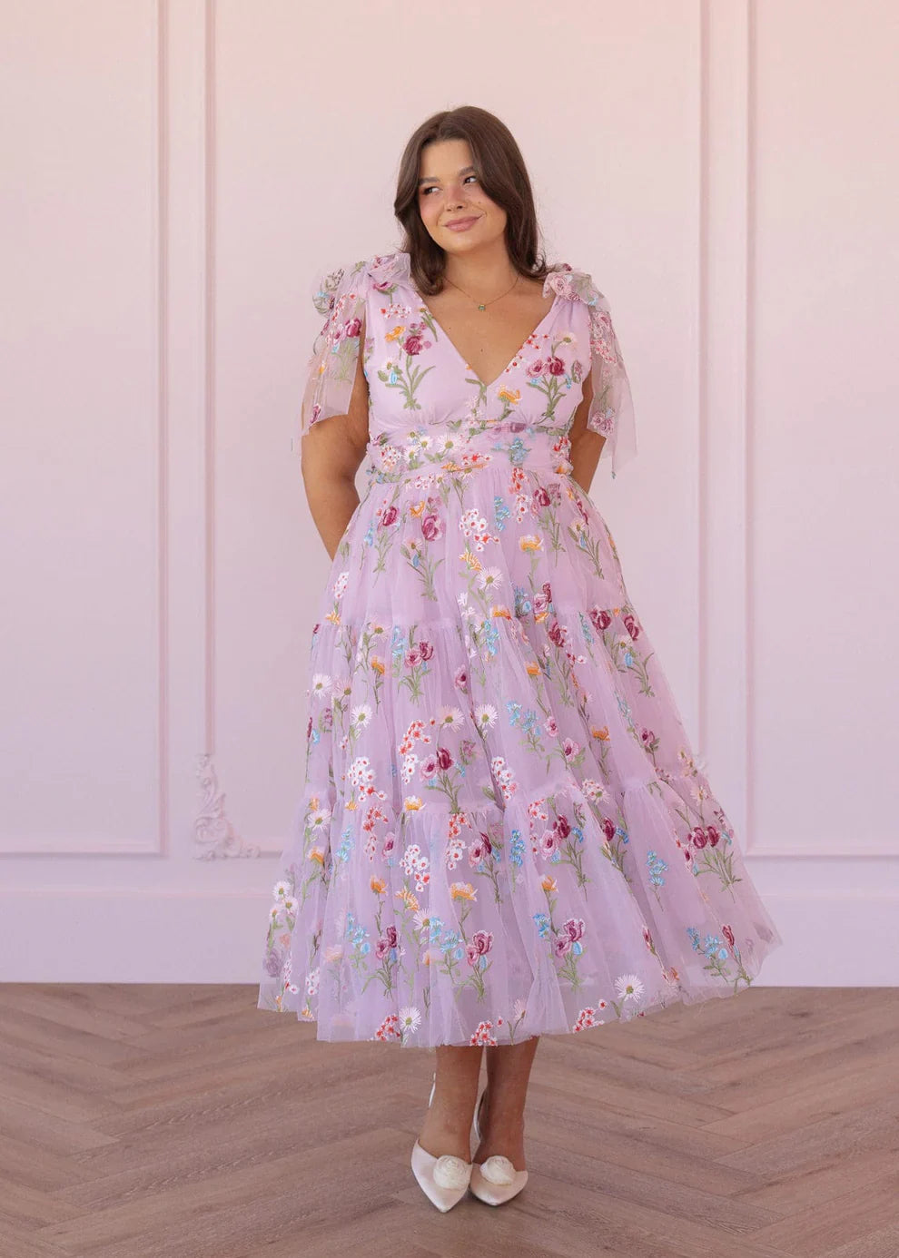 The Margaret Dress in blush is soft, whimsical, and utterly enchanting. Delicate floral embroidery dances across layers of airy tulle, while the ruched bodice and bow-tied shoulders add a touch of fairytale romance. Its dreamy tiered skirt creates graceful movement with every step. Perfect for bridal showers, spring soirées, or simply twirling through a sun-drenched afternoon.