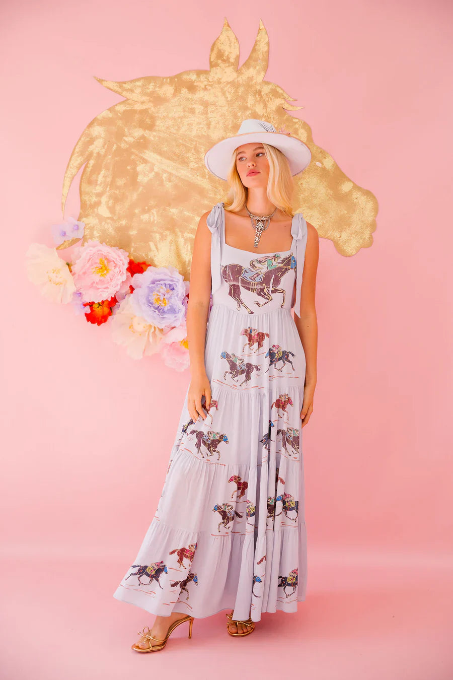 Unleash your inner fashion jockey with the VICTORY LAP BLUE DRESS. This light blue maxi dress will have you feeling like a winner as the straps tie in a flattering way, while the unique race horses design adds a playful touch. Perfect for any event, from a day at the races to a garden party (or just galloping around town!).