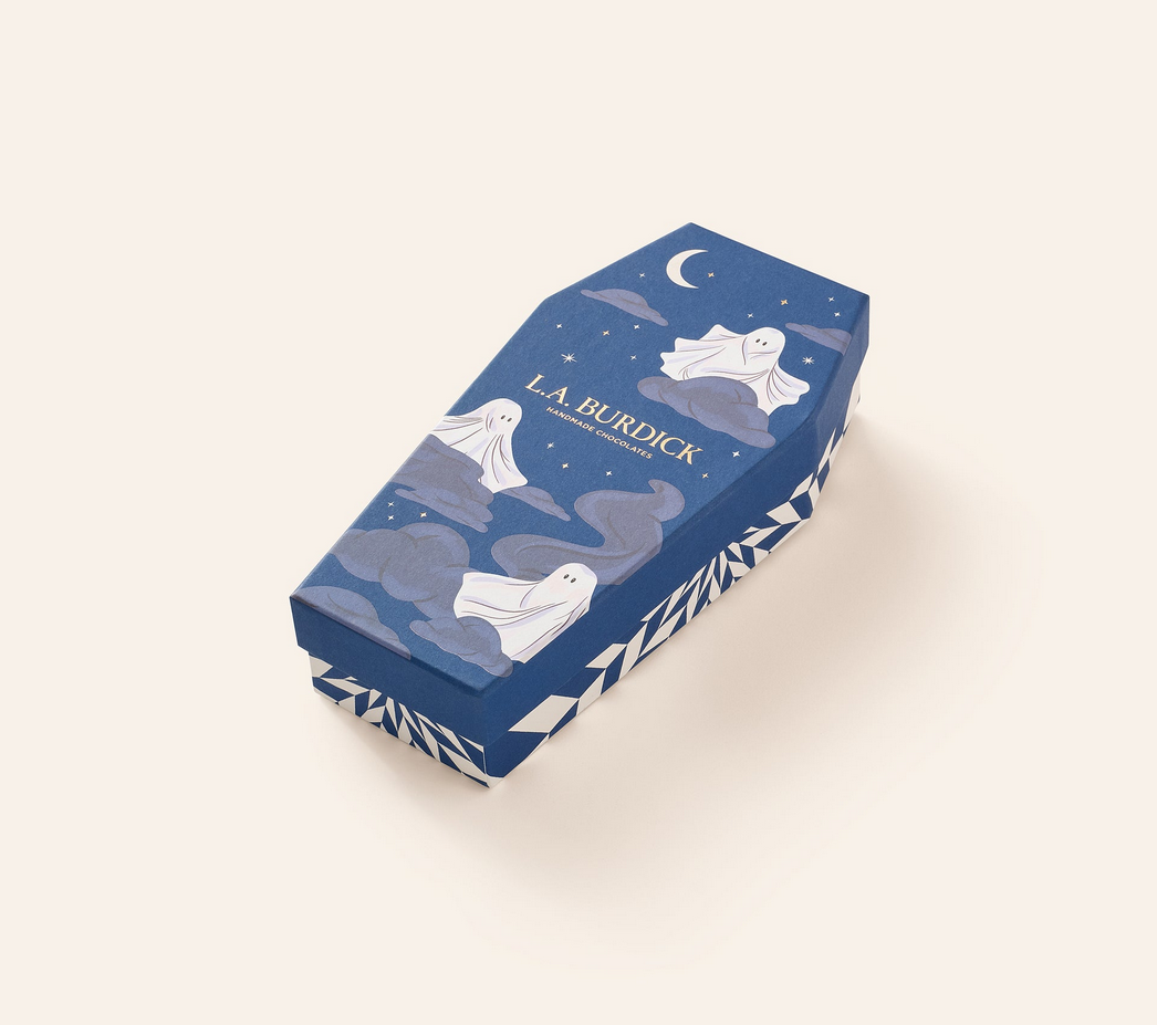 Beneath the light-hearted packaging lies our gravely serious commitment to chocolate excellence. The Coffin Assortment was created as a Halloween companion to our beloved Chocolate Ghosts. The Head Chocolatier’s dinner conversation with a close friend led to the x-eyed, mischievous Chocolate Mouse and soon the collection expanded with miniature Chocolate Ghost, crescent moon, spiky garnishes, spicy ganaches, black salt, and dark licorice root. A deep, delicious dive into the delights of the spookiest season.