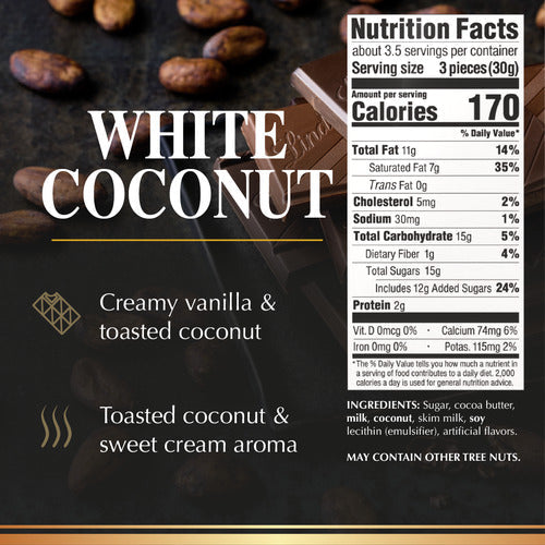 Dive into the refined richness of the Lindt EXCELLENCE Coconut White Chocolate Bar. Expertly crafted, this white chocolate candy bar awakens your senses with the exciting tropical flavor that comes from crisp flakes of fine white coconut enrobed in smooth-melting, premium white chocolate. The sophisticated, exotic flavors in this gourmet chocolate bar make an impeccable pairing with sparkling wine. Gift the complex flavor and sophisticated texture of Lindt white chocolate with coconut to a chocolate connoisseur, or add it to your baking for a tropical touch. These white chocolate bars come pre-portioned into bite size squares for balanced complexity in every bite. Lindt chocolate is masterfully crafted using the highest-quality ingredients from world-renowned regions, embodying the passion and craftsmanship of Lindt Master Chocolatiers.