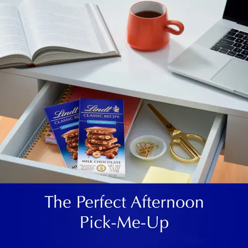 Indulge in smooth milk chocolate with crunchy whole hazelnuts and caramelized hazelnut pieces with Lindt CLASSIC RECIPE Whole Hazelnut Milk Chocolate Bar. Expertly crafted premium milk chocolate goes to the next level with decadent hazelnuts, providing a rich, delicious flavor with a satisfying crunch. Enjoy this indulgent treat after dinner or use these hazelnut chocolate bars as a midday pick-me-up. Made with the finest ingredients, this milk chocolate candy bar also makes a delicious gift for any chocolate lover. Each bar is portioned into perfect bite-sized pieces, making it easy to share or enjoy a few pieces anywhere. Lindt chocolate embodies the passion and expert craftsmanship of the Lindt Master Chocolatiers for a distinctly smooth melting chocolate experience in every bite.
