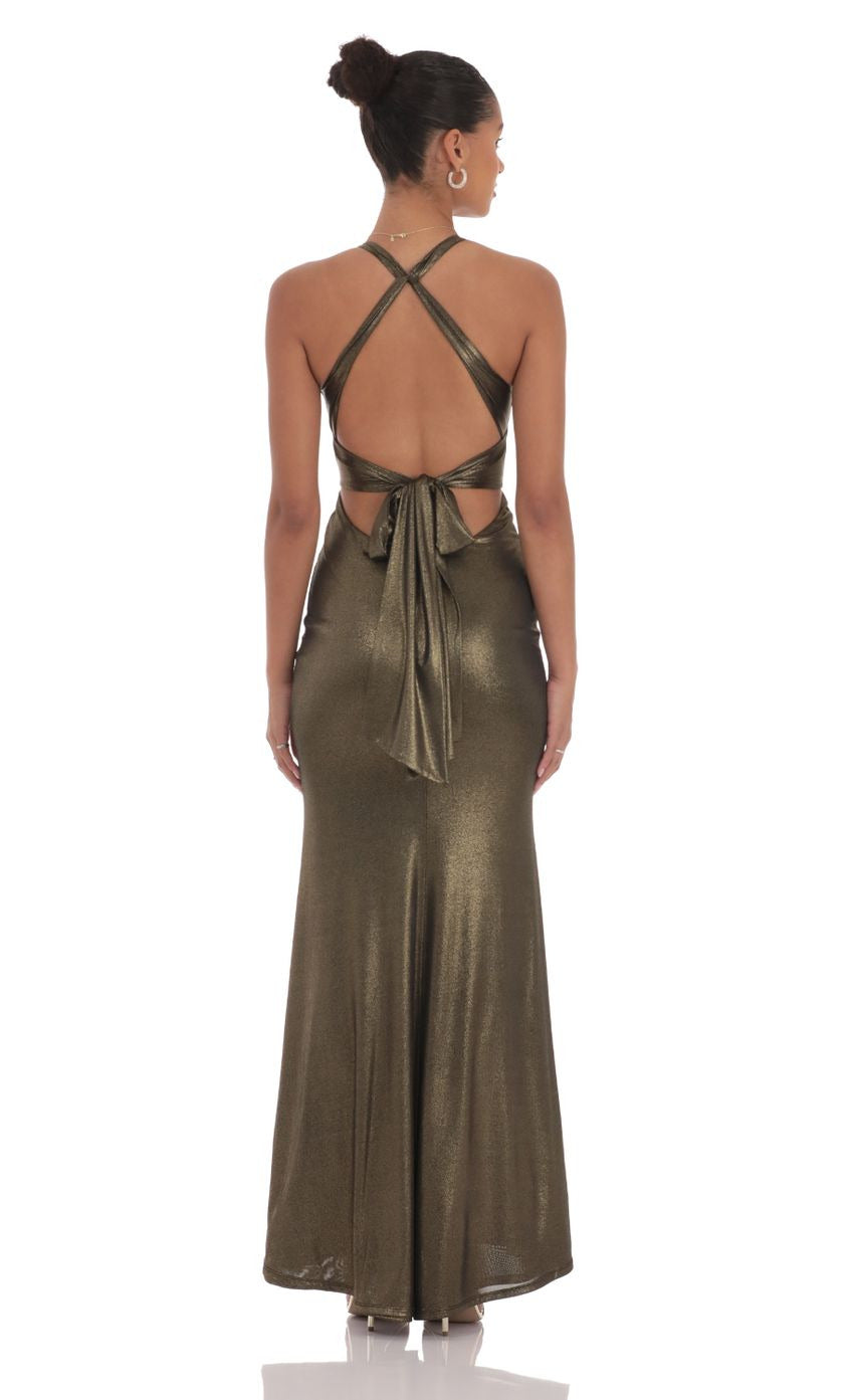 Lucy in the Sky Foiled Twist V-Neck Maxi Dress in Black and Gold