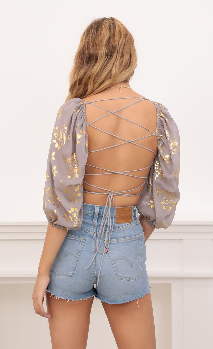 Lucy in the Sky Gold Floral Puff Sleeve Top in Grey