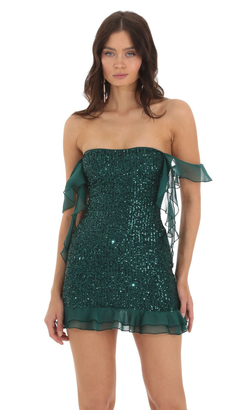 Lucy in the Sky Kiraz Sequin Off Shoulder Dress in Green