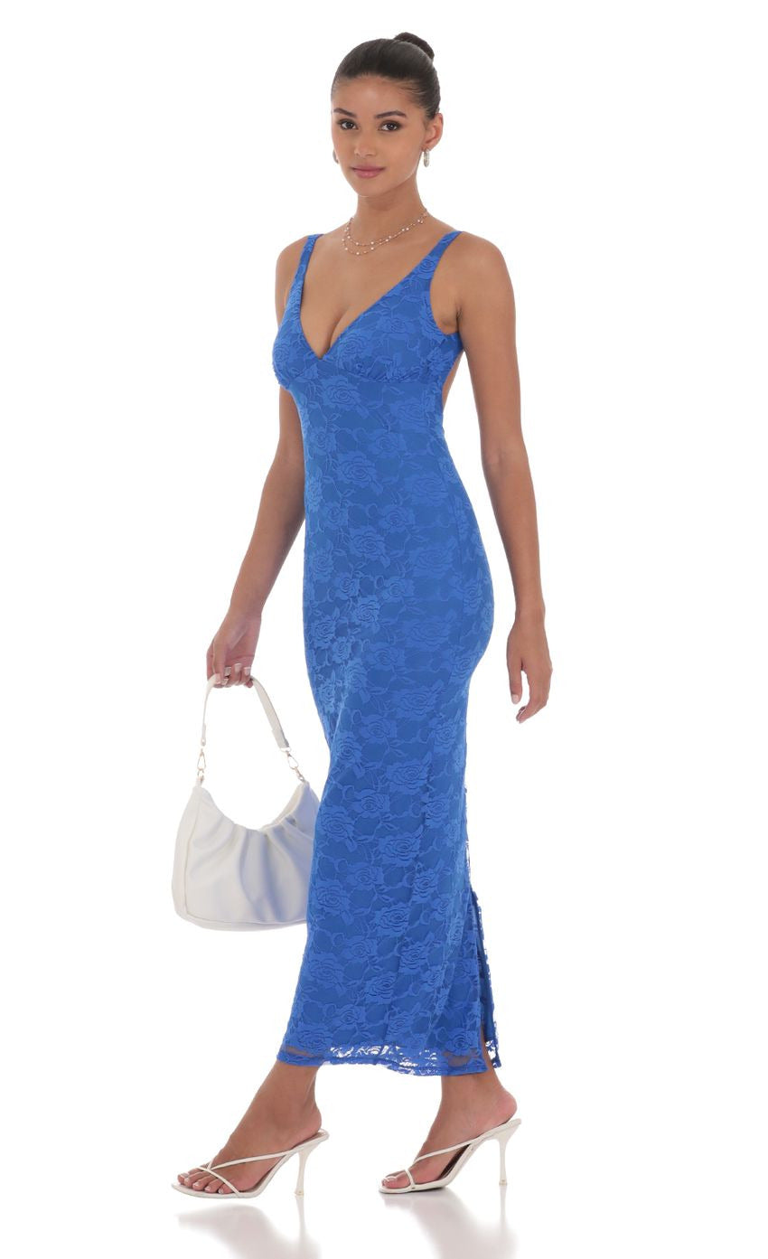 Lucy in the Sky Lace Open Back Bodycon Maxi Dress in Blue