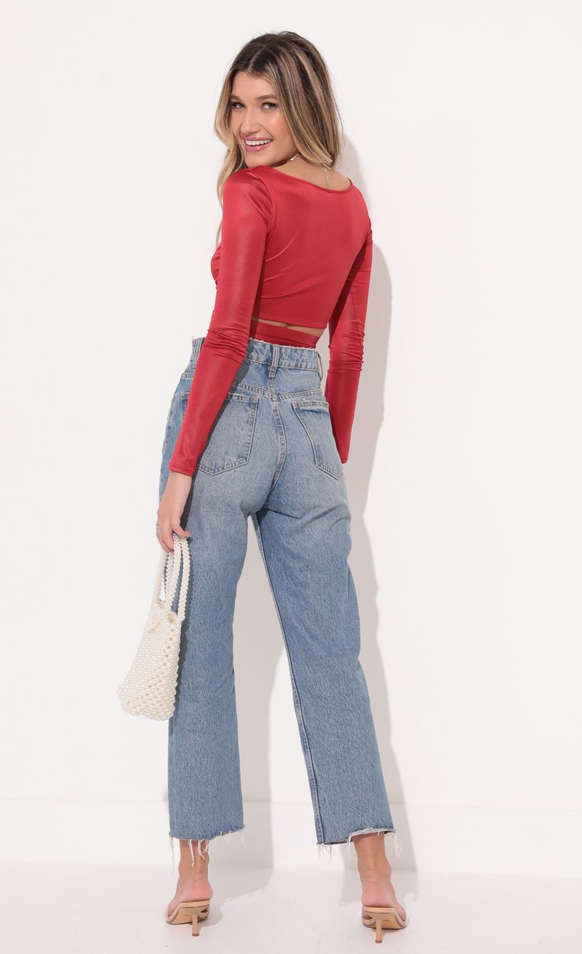 Add some sass to your go to crop top, The Tori Long Sleeve Top will quickly become your favorite. Features a metal O-ring with intricate shirring and a wrap around tie front or back feature. Made in our black shimmer stretch fabric. Pair with your go to jeans and add heels or sneakers to fit the occasion.