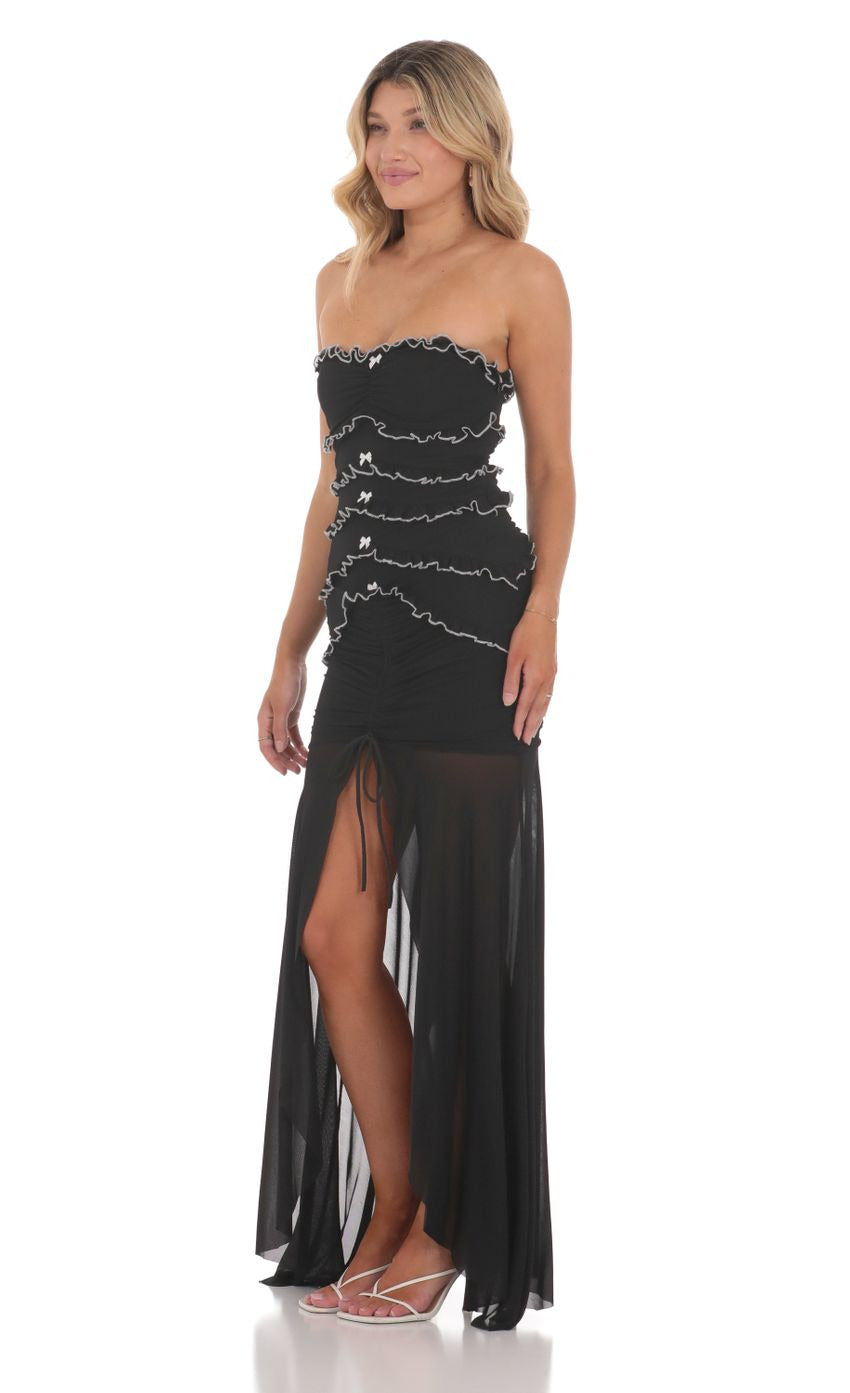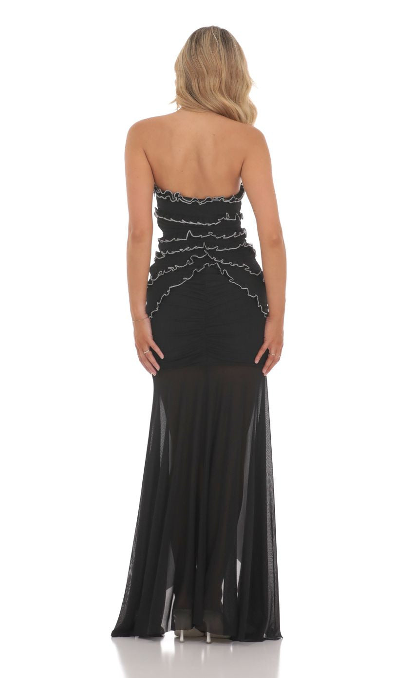 Lucy in the Sky Mesh Strapless Ruffle Bodycon Maxi Dress in Black
