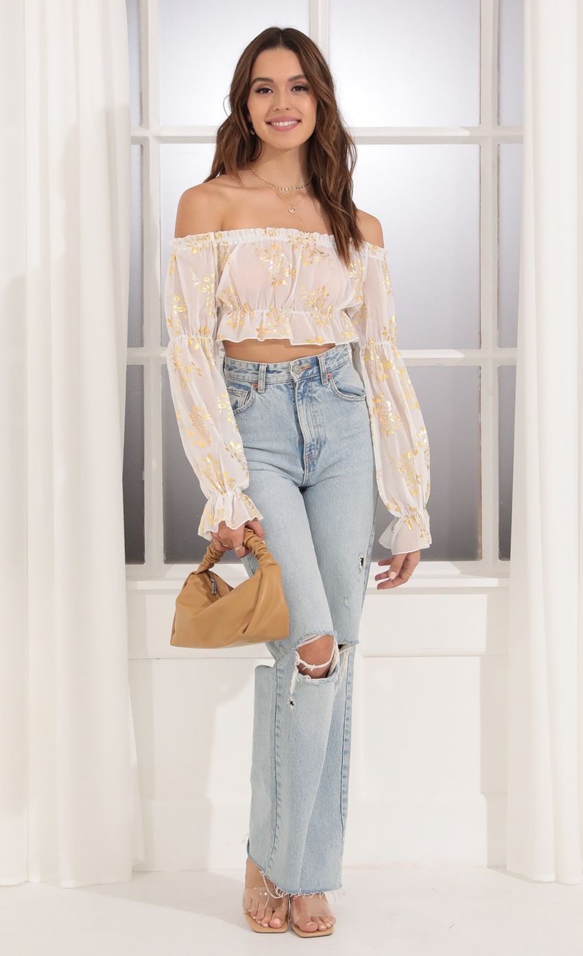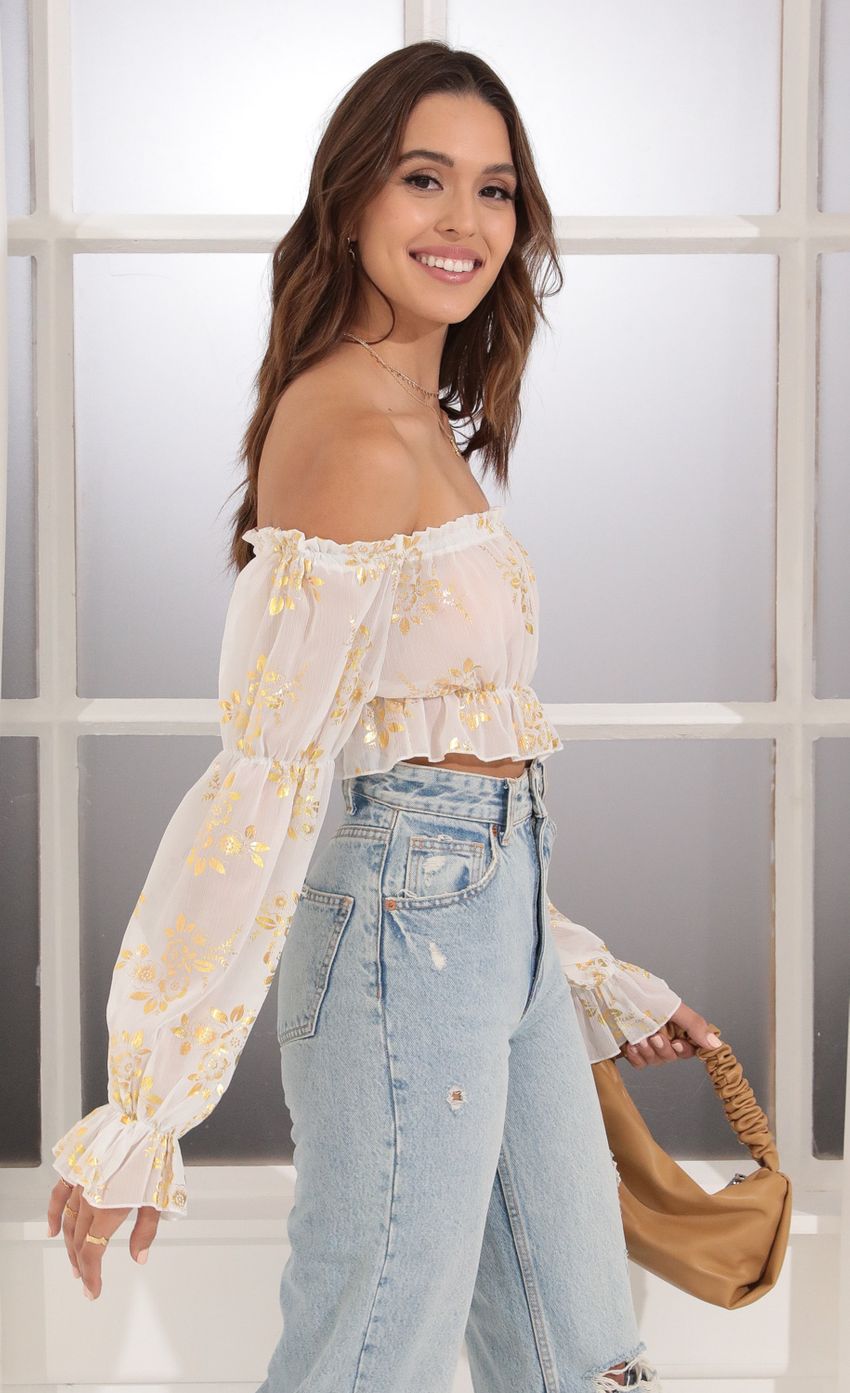Perfect for brunch or dinner at sunset! Features off the shoulder design and elastic necklaline and wrists. Made in our royal white chiffon fabric with a gold floral print. Pair with your favorite high waisted jeans or skirt and let the compliments roll in!