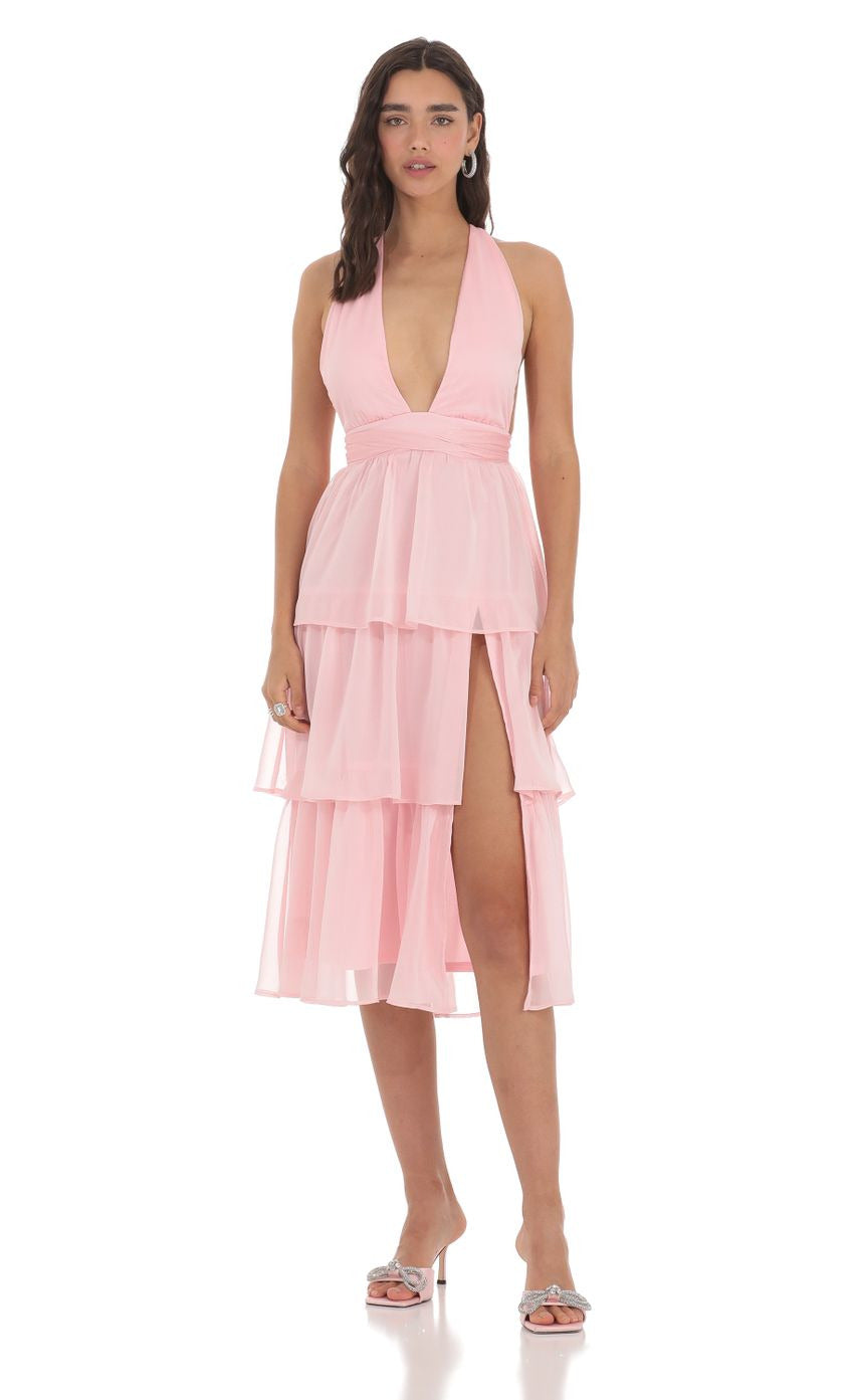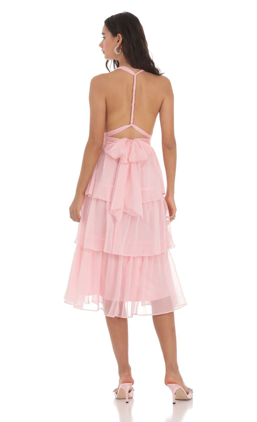 Lucy in the Sky Open Back Ruffle Midi Dress in Pink