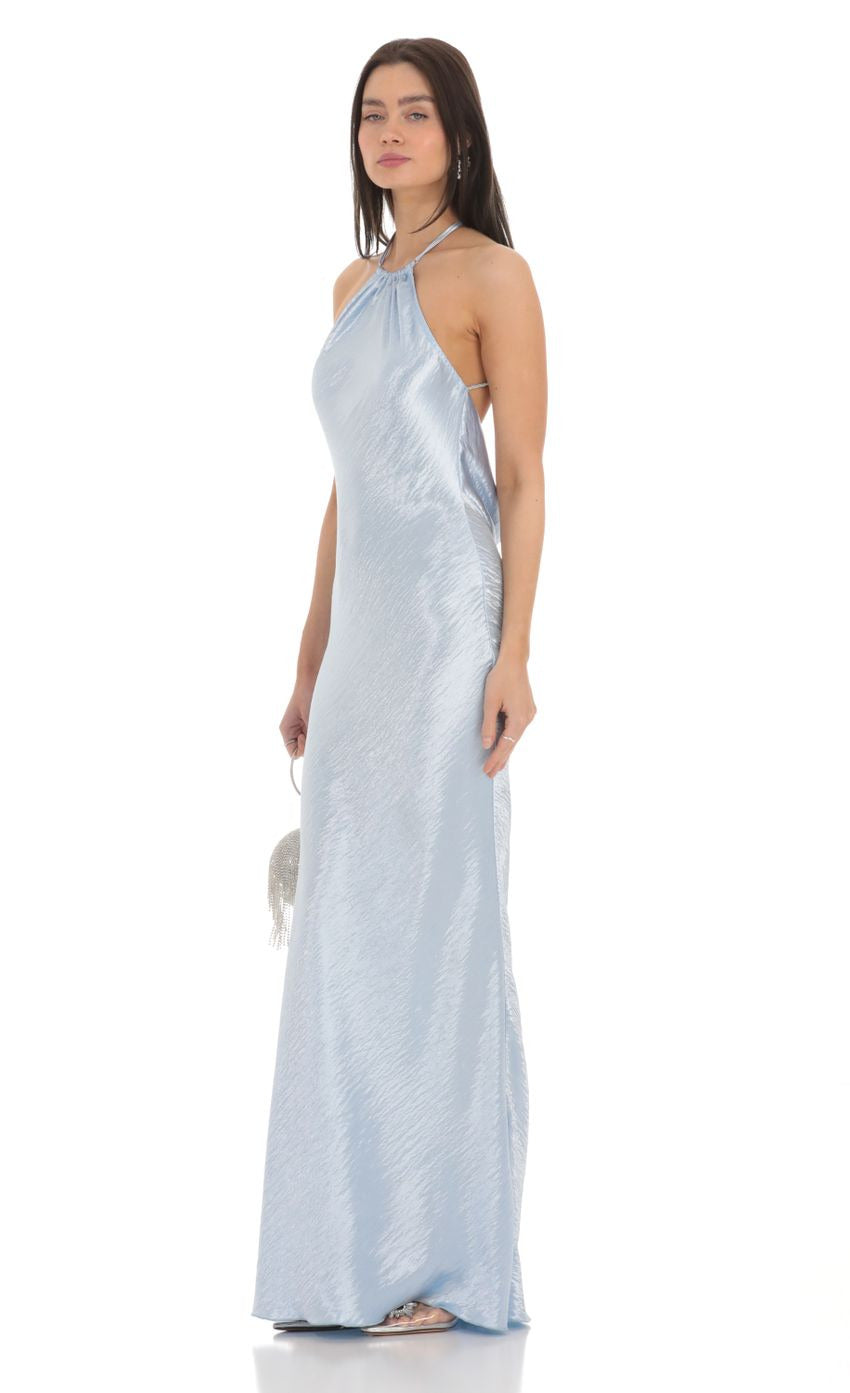 Lucy in the Sky Rhinestone Satin Open Back Maxi Dress in Blue