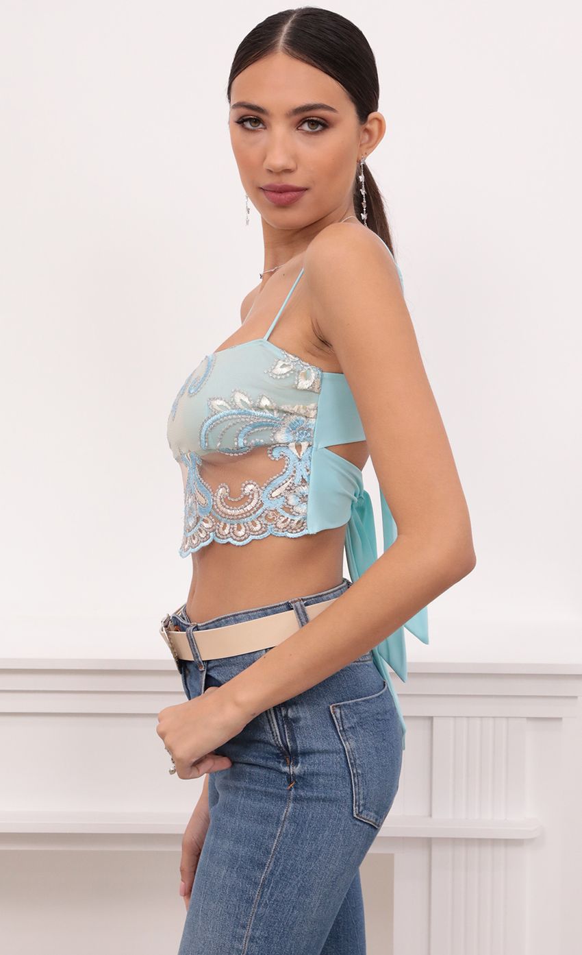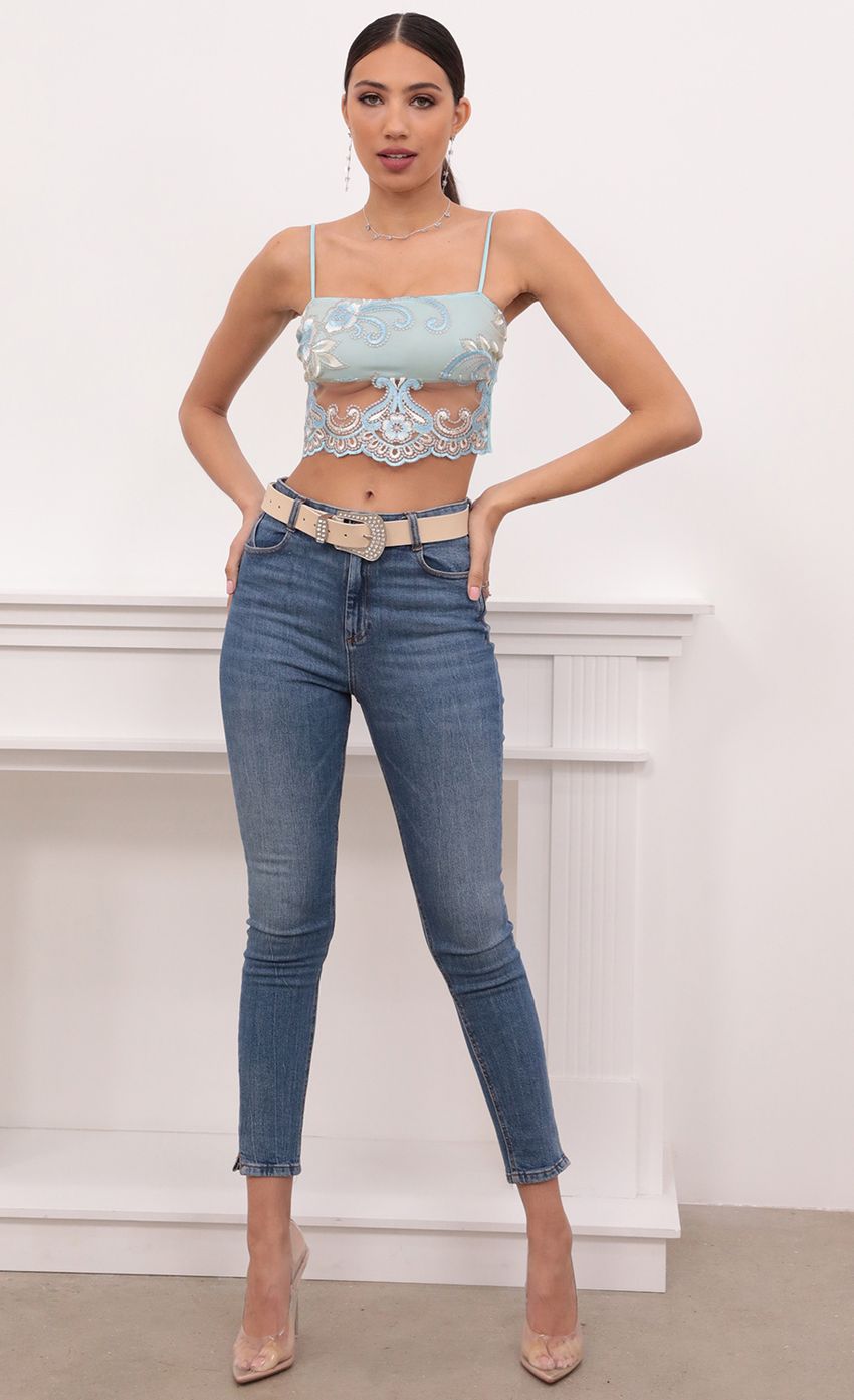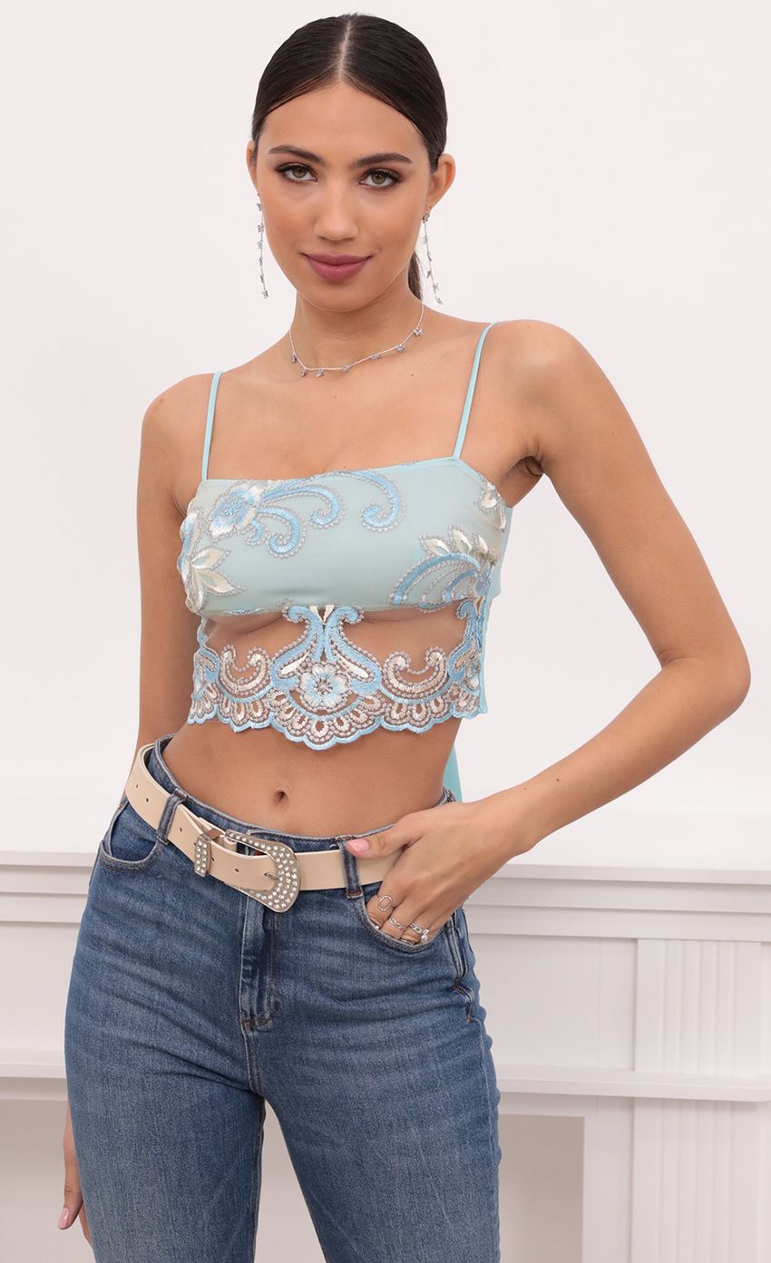 This crop top is giving us serious mermaid vibes! Featuring our high-end off white and aqua detailing lace. Pair with highwaisted denim or a mini leather skirt to take this look from day to night! This crop top will add some drama to any look.