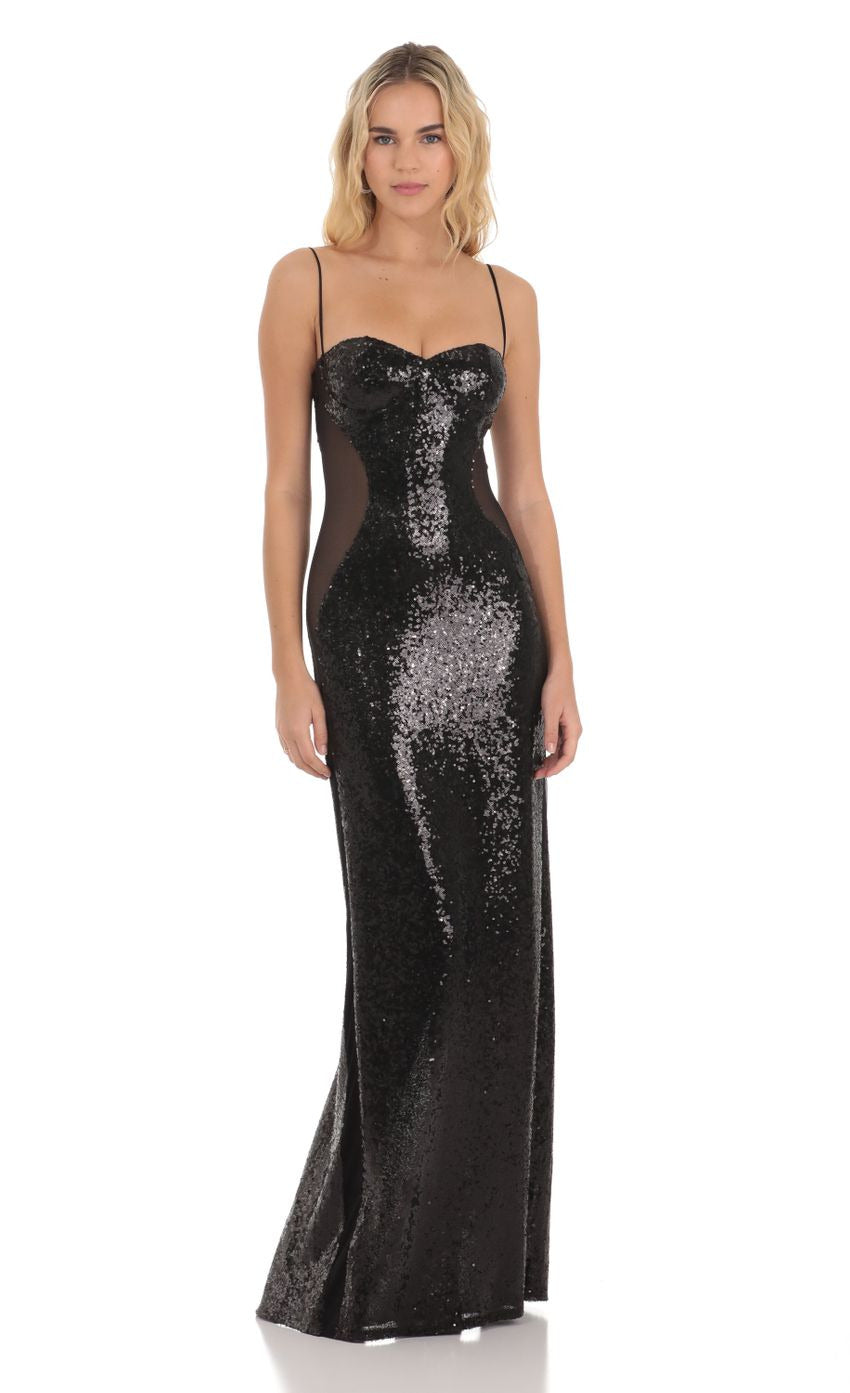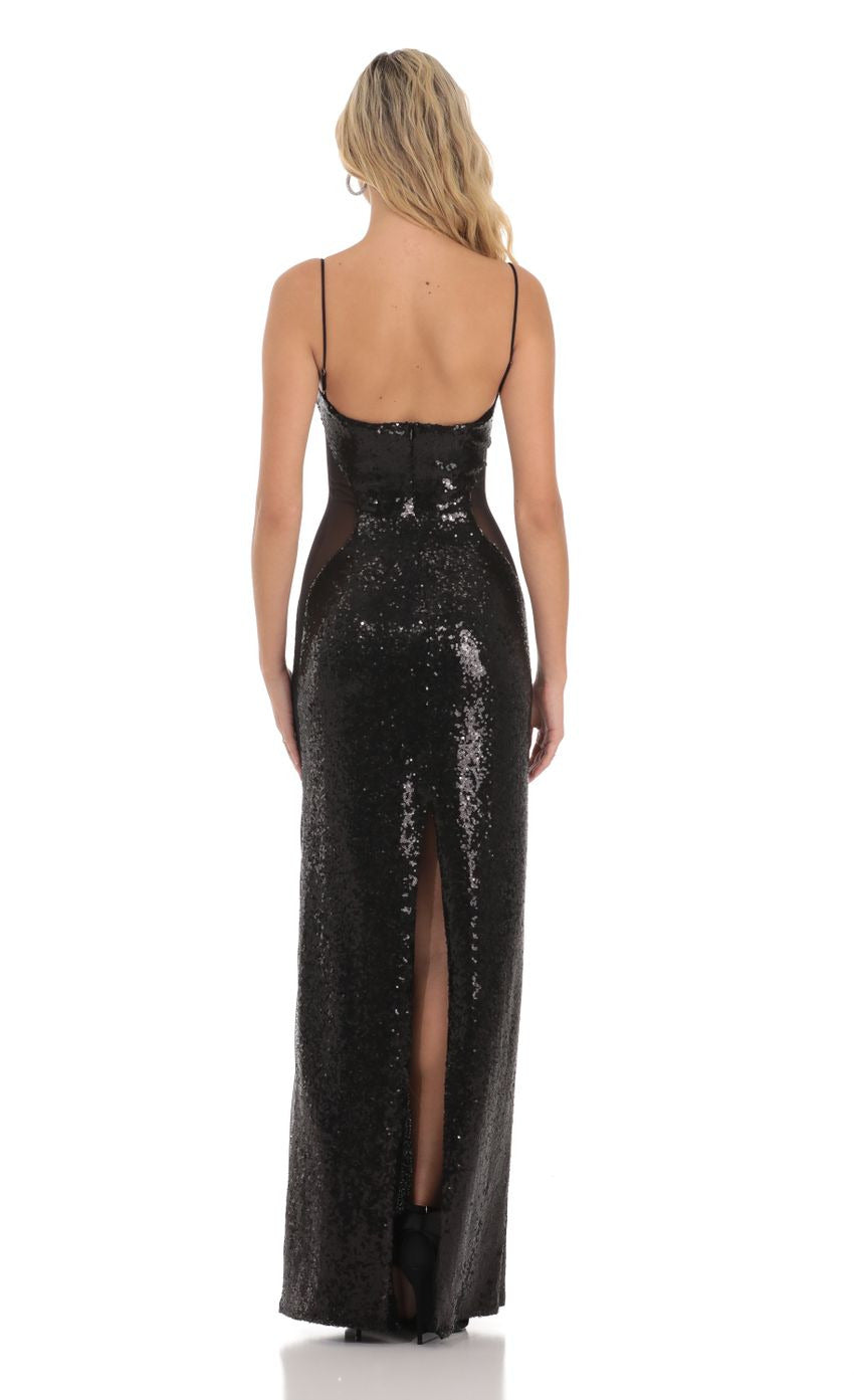 Lucy in the Sky Sequin Mesh Side Cutout Maxi Dress in Black