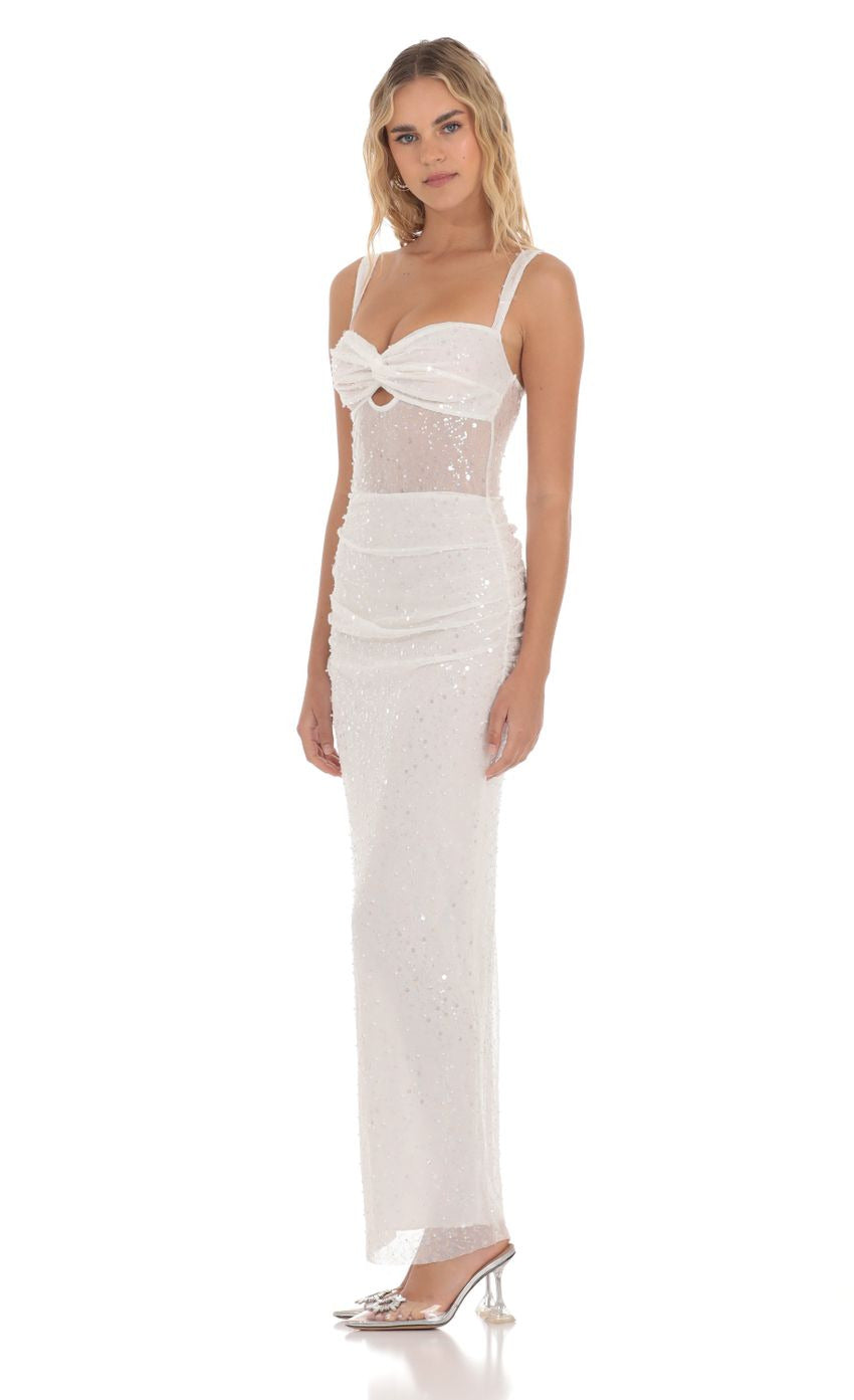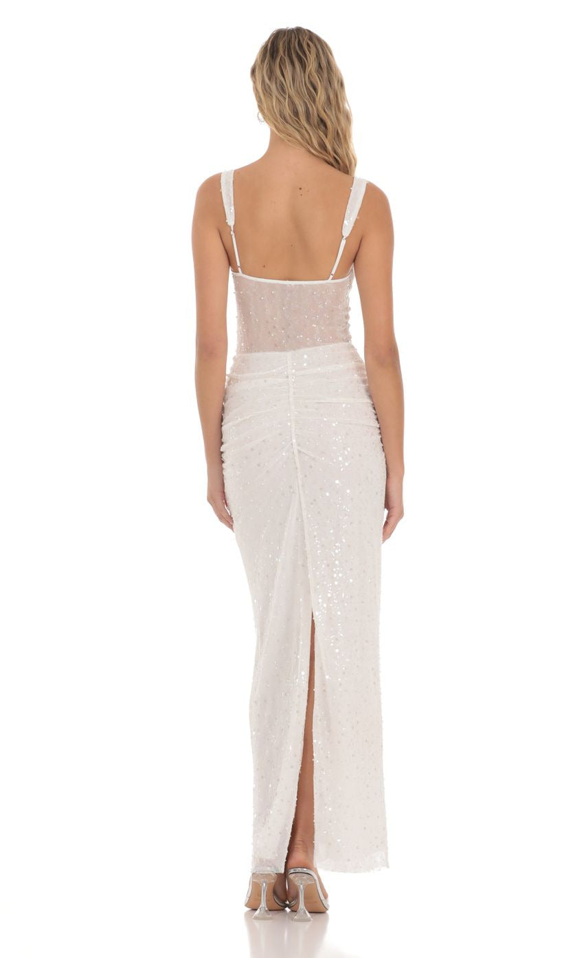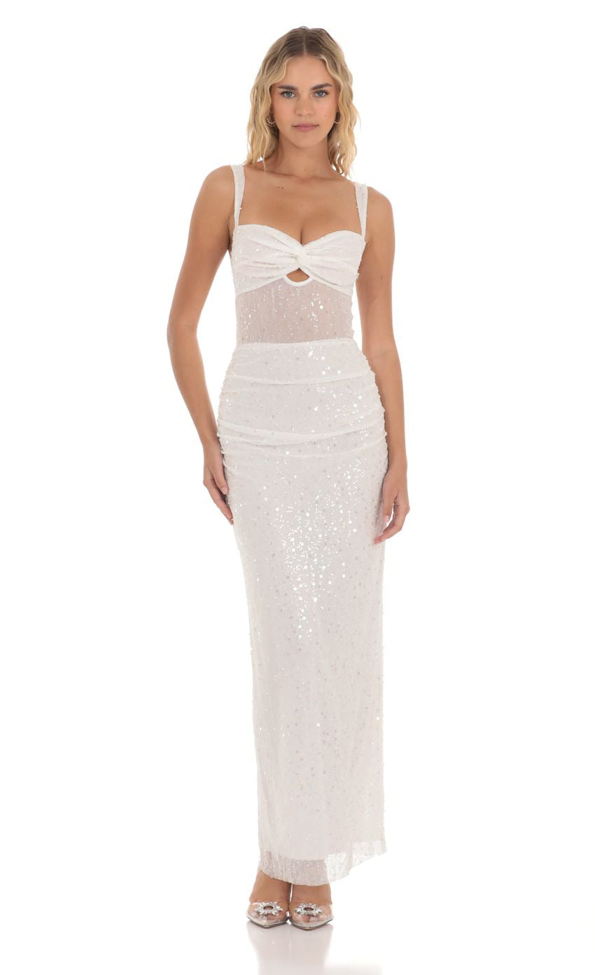 Lucy in the Sky Sequin Pearl Twist Ruched Maxi Dress in White