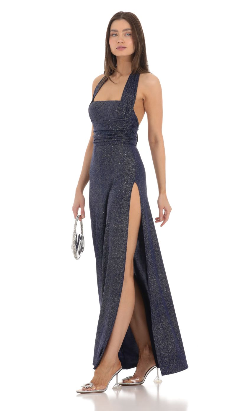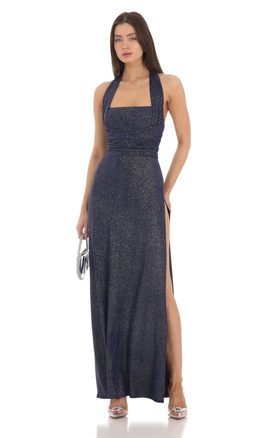 Lucy in the Sky Shimmer Halter Maxi Dress in Navy