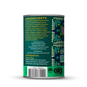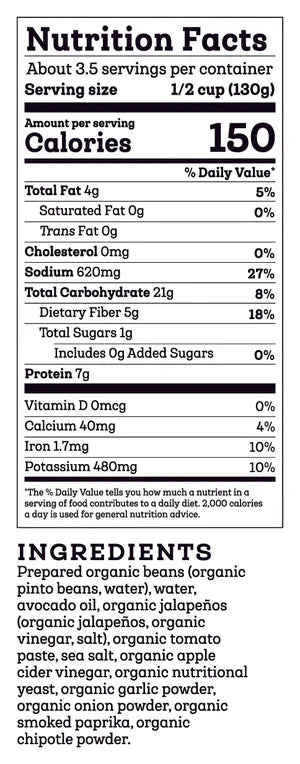 Prepared organic beans (organic pinto beans, water), water, avocado oil, organic jalapeños (organic jalapeños, organic vinegar, salt), organic tomato paste, sea salt, organic apple cider vinegar, organic nutritional yeast, organic garlic powder, organic onion powder, organic smoked paprika, organic chipotle powder.
