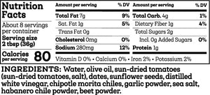 Water, olive oil, sun-dried tomatoes (sun-dried tomatoes, salt), dates, sunflower seeds, distilled white vinegar, chipotle morita chiles, garlic powder, sea salt, habanero chile powder, beet powder.