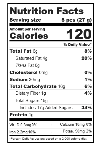 Sugar, Cocoa Liquor, Cocoa Butter, Tequila (2.1% Alc. Vol.), Alcohol (2.1% Alc. Vol.), Cornflakes (Corn, Sugar, Salt, Malted Barley [Gluten]), Lactose (Milk), Almond Pieces, Hazelnut Pieces, Gum Arabic, Salt, Confectioner's Glaze, Soy Lecithin, Natural Vanilla Flavor, Glucose Syrup